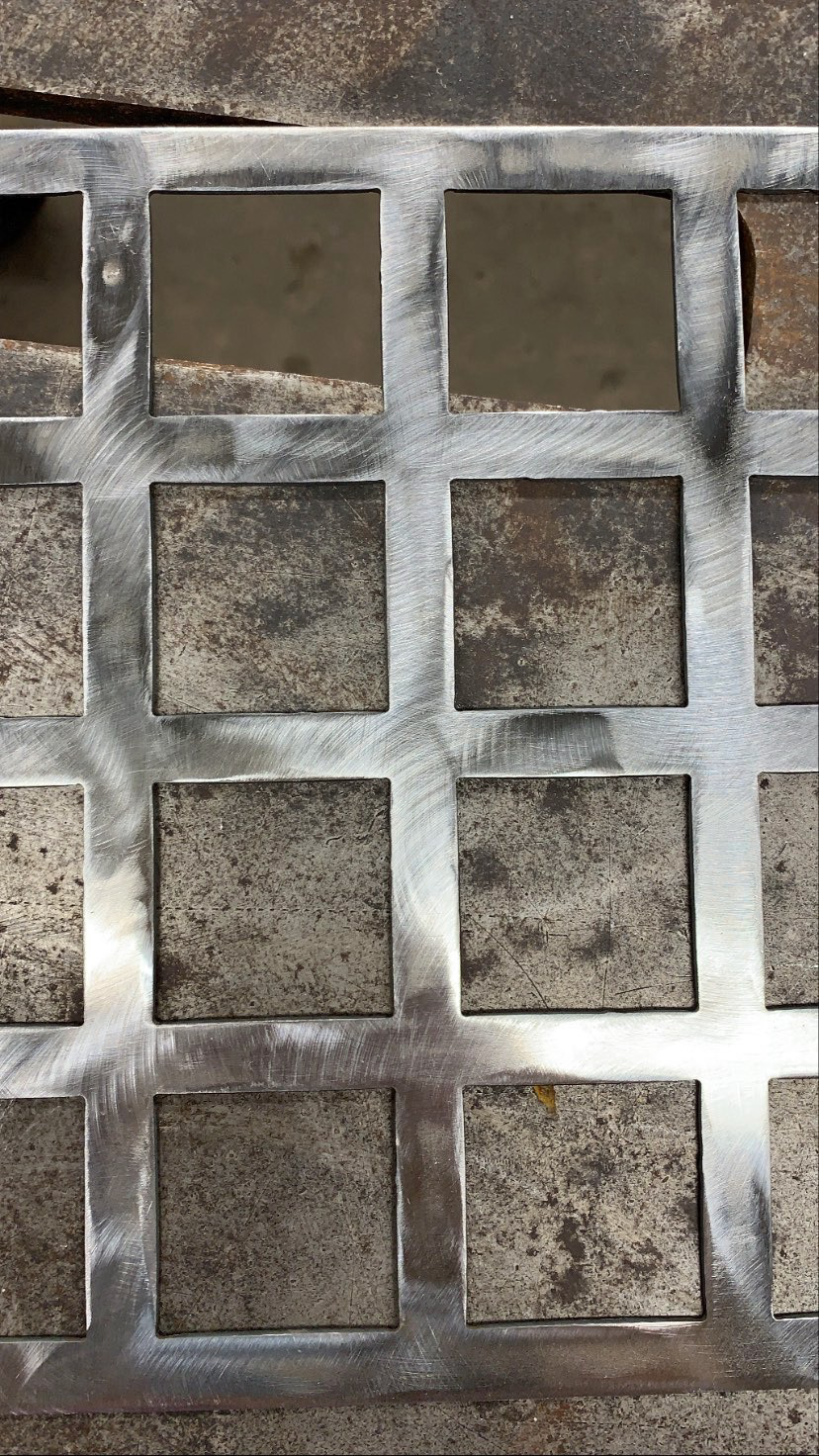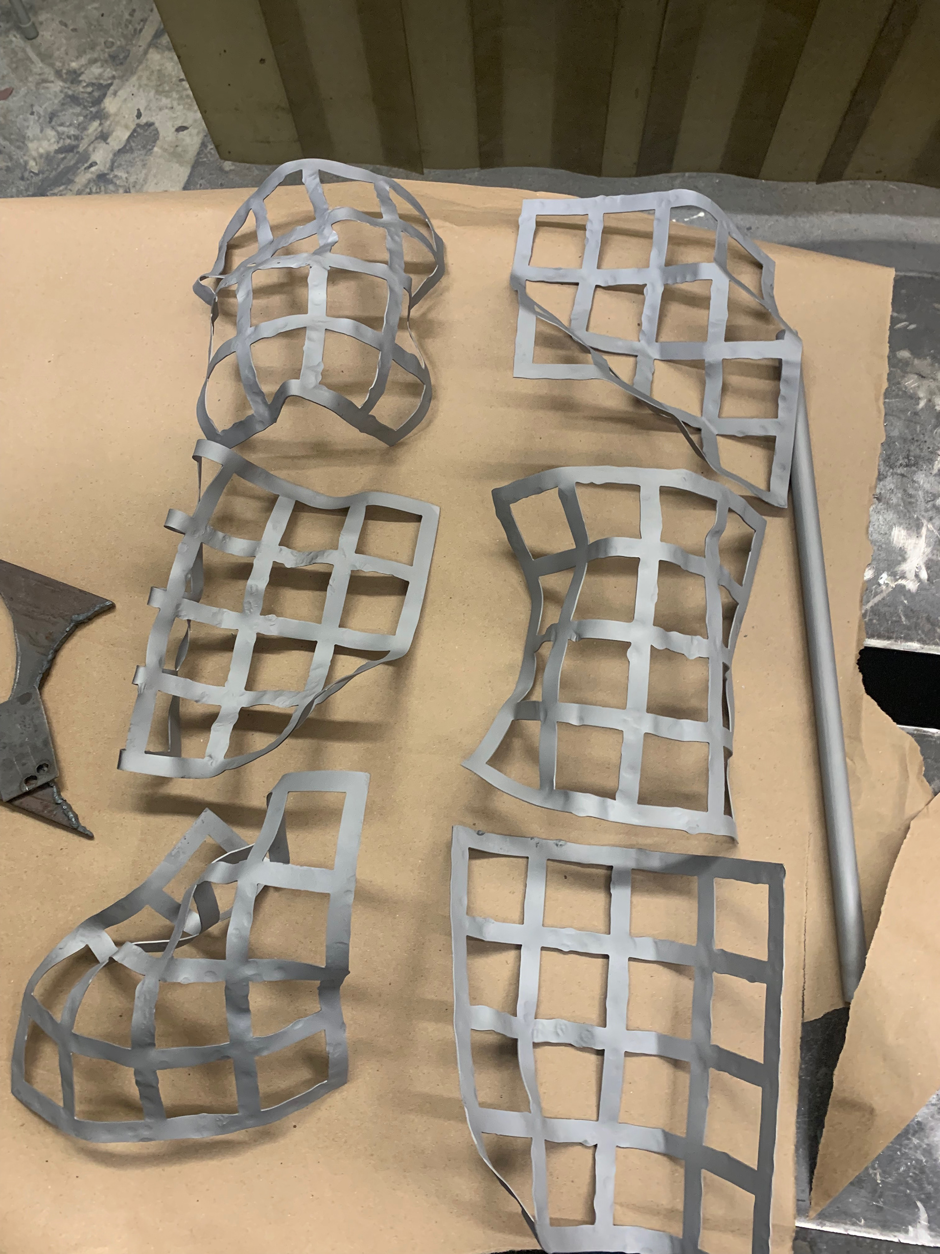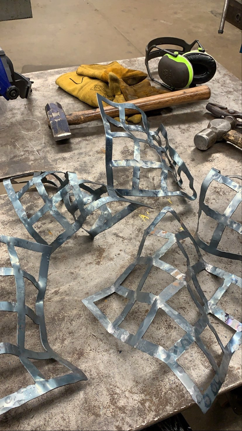 Maple loom constructed with 12 equal segments; CNC plasma cut grids forged then powder coated in gloss black. Cotton warp thread, repurposed textiles, 11.5" x 55.5"